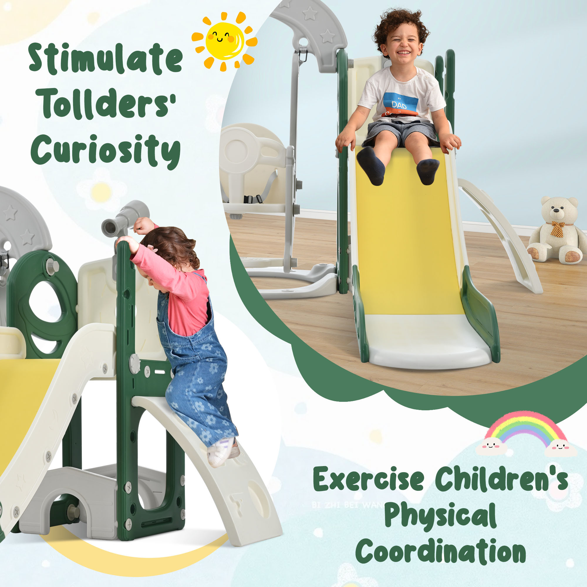 [Children's Playground 5-in1] Refreshing styling design! Delicate and cute freestanding swing and slide set for toddlers with five functional parts: 1 slide, 1 climbing ramp, 1 swing, 1 telescope, and 2 golf holes. This set allows children to completely release their playful nature, and they can play with their friends for hours!